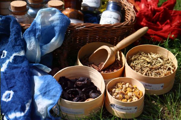 We discover the different plants that can be used to dye natural fabrics made from wool, linen, silk and cotton, and we dye a woolen or silk fabric ourselves with batik patterns of our own imagination.